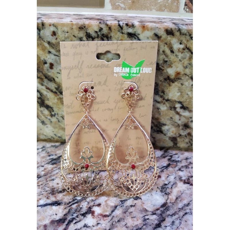 New 1 Earring Set. Dream out Loud by Selena Gomez. Dangly earring set approximately 3 inches long. Gold in color with dark red accents. Check out the pictures for more details. Retails for $7.99. Comes from a clean, smoke free home. Ships same day in most cases. Thanks for looking....