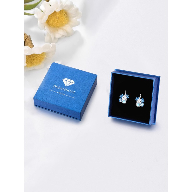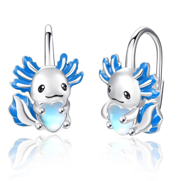 Dreamboat Blue Axolotl Leverback Earrings for Women 925 Sterling Silver Moonstone Stitch Animal Dangle Drop Hoop Jewelry Gifts for Axolotl Lovers