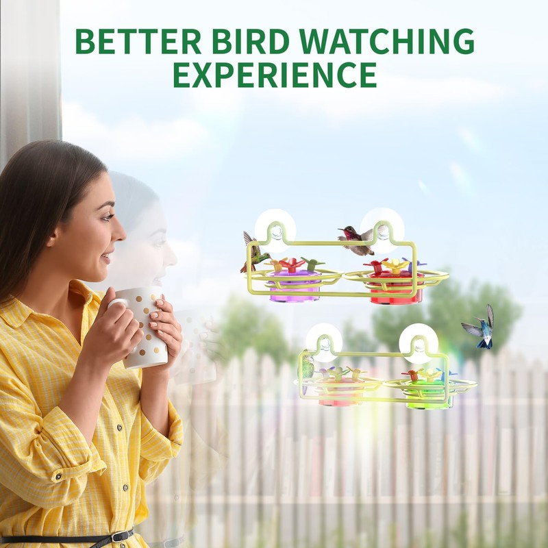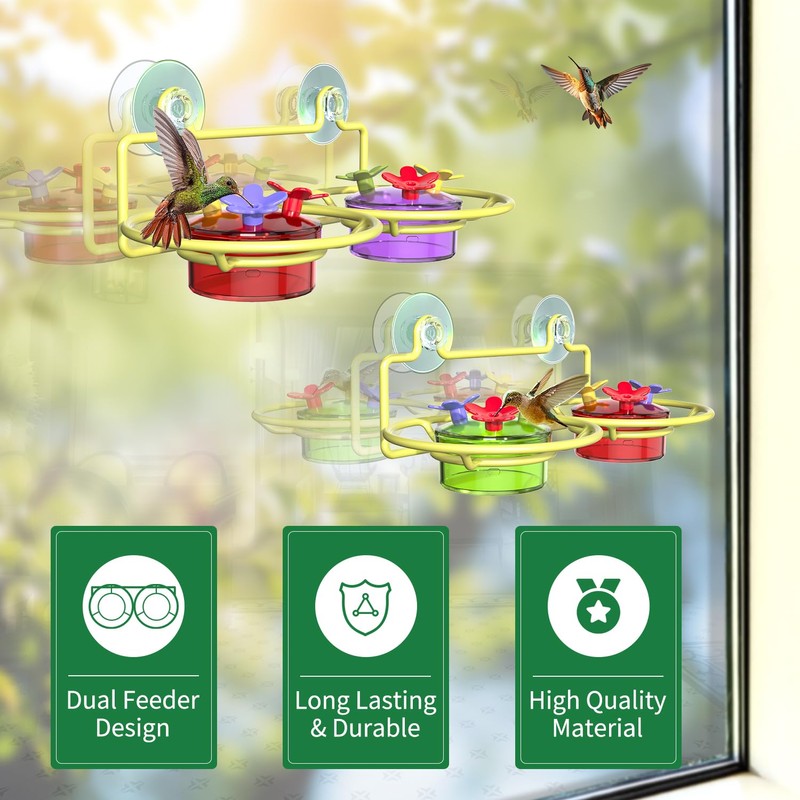 - Small Window Hummingbird Feeder: Our feeder features metal base that attaches to your window with strong suction cups. The base holds two containers, each with a capacity of 2 ounces, and each container includes three bee-proof feeding ports. Bright red and yellow flower accents attract hummingbirds to your window for a close-up feeding experience.