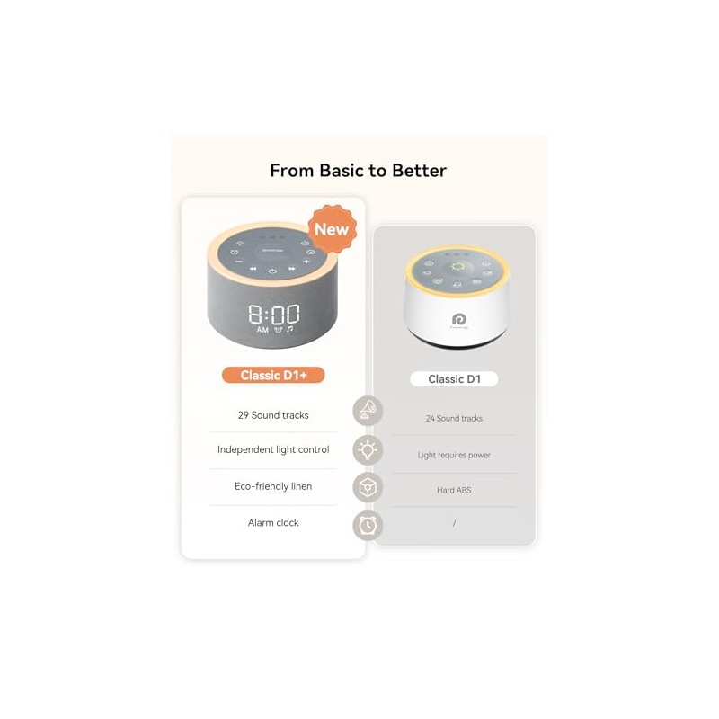 - - The upgraded Classic D1+ white noise machine now features a alarm clock and dimmable time display, wrapped in eco-friendly fabric. Whether you're trying to drift off to sleep or make waking up less of a chore, this sound machine alarm clock has you covered.