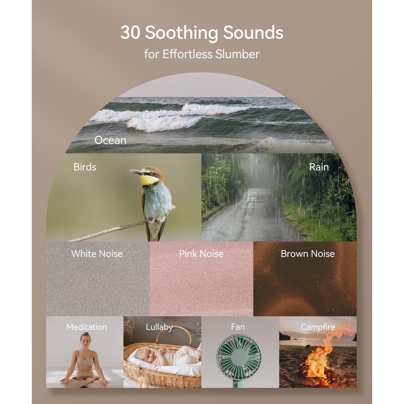 - 30 soothing sounds: such as white noise, natural forest bird sounds, sea waves, rain, flowing water, lullabies, meditation music, etc., which can effectively mask other annoying sounds and create a perfect sleeping environment for you and your family, so you can easily fall asleep. Optionally, a 5-180 minute sleep timer and 30 volume levels are available for individual adjustment.