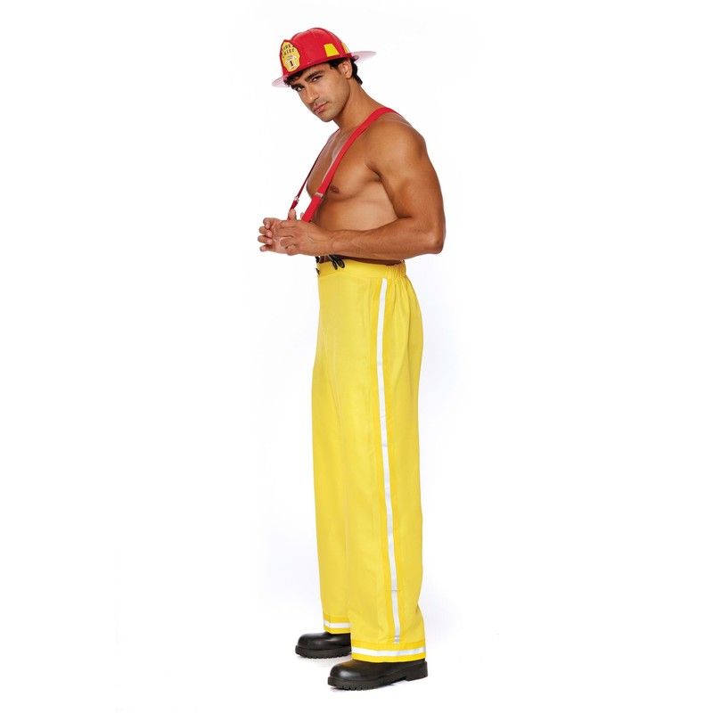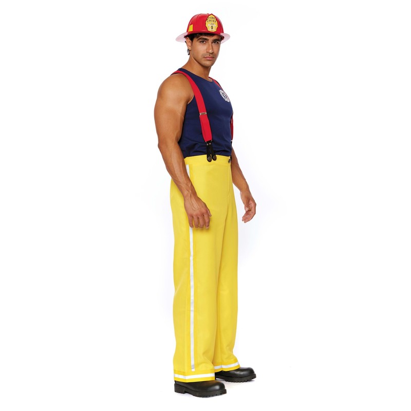 - Molded plastic fire hat Sleeveless knit shirt Poly poplin pants with reflective tape trim and elastic back waist Elastic suspenders (Four-Piece Set)