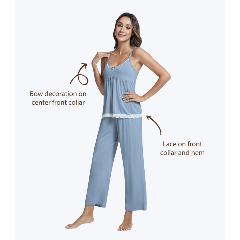 - [Design Features] Adjustable-strap cami top + long pants set. Features lace trim at neckline & hem, pre-tied bow at front neck, top with front seams & stay tape. Elastic-waist pants for comfort.