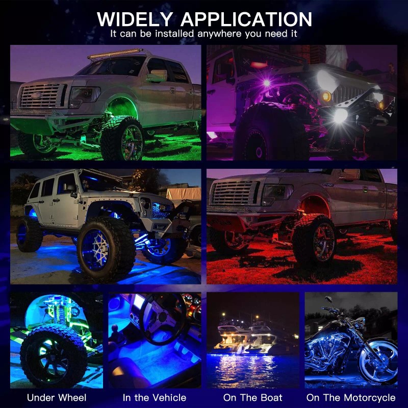 Widely Application & Warranty: Rock lights kits can be widely used in car, off road, truck, ATV, UTV, SUV, ATV motorcycle, boat and so on, also used for interior, dome, neon lights, yacht lights, ect. 2 Types of Mounting included, drill or no drill.