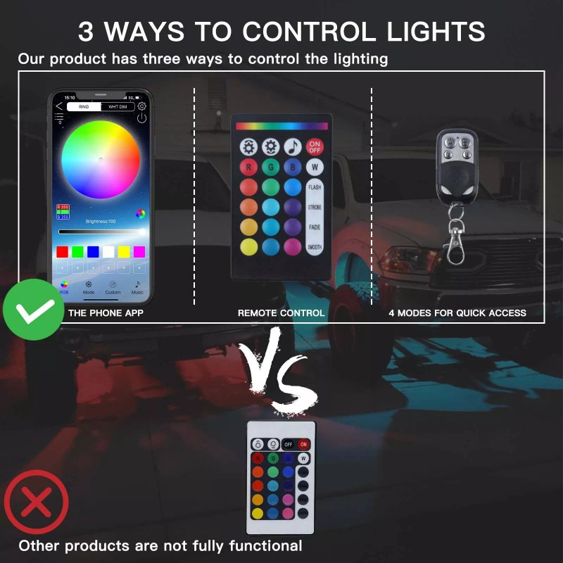 3 Control Modes: 4 keys & 24 keys remote control, APP control to avoid connecting issues, which you can adjust the change speed, brightness and stroboscopic speed. You can control more than 2 sets of rock lights together.