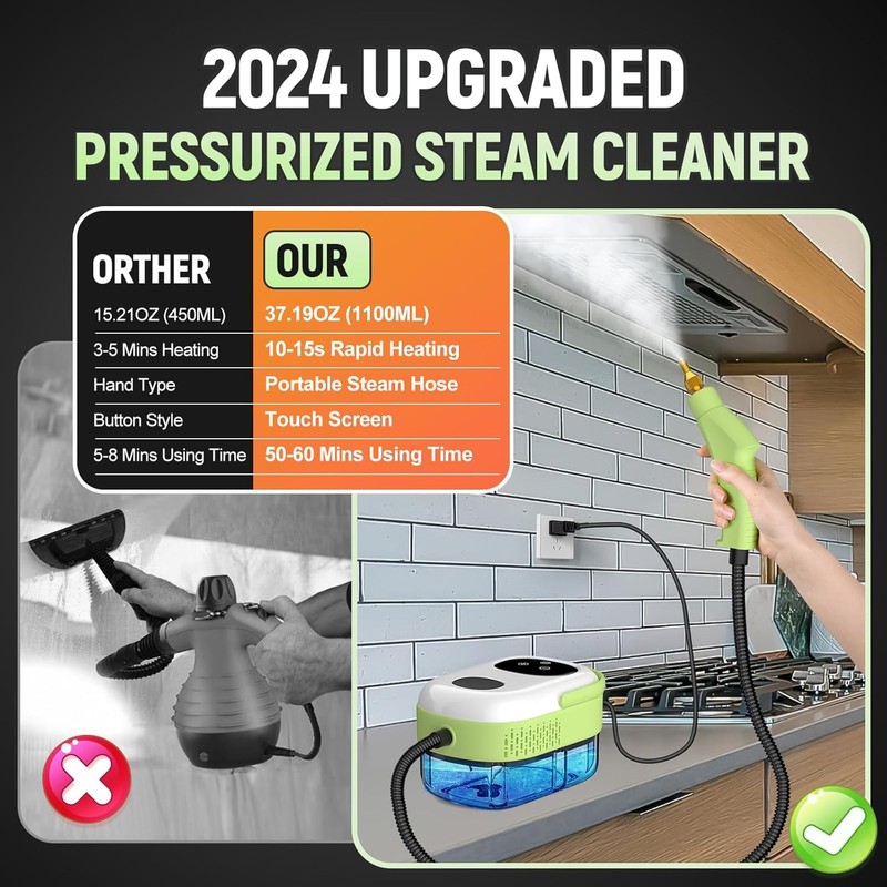 - 【Chemical-Free Steam Cleaner】Our safe and reliable handheld steam cleaner uses only water, eliminating the need for harmful chemicals. It effectively cleans all types of house cleaning and hard-to-reach areas, making it an ideal choice for families who with children, elderly members, pregnant individuals and pets.
