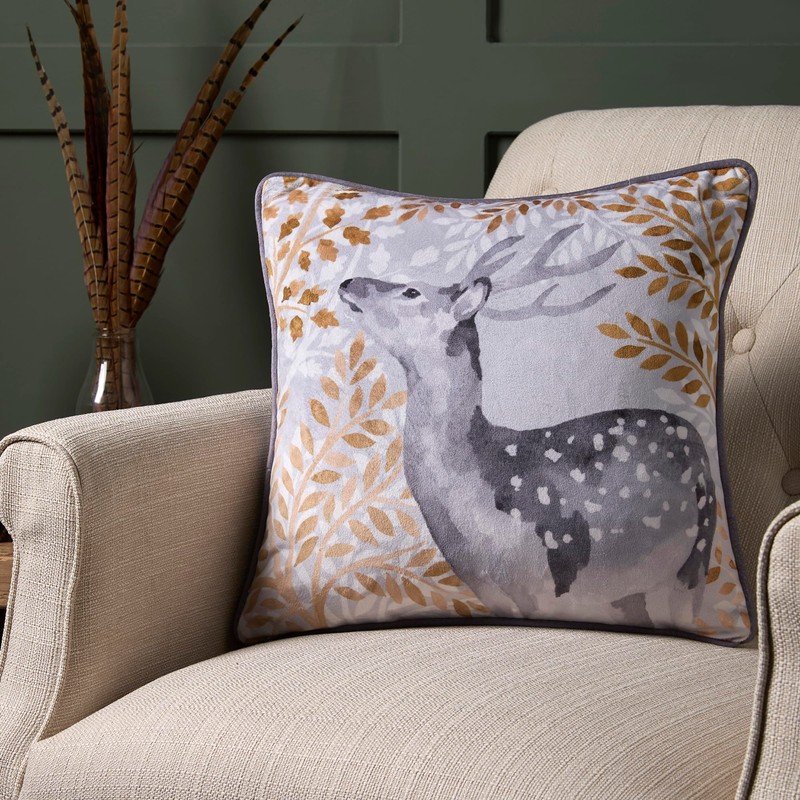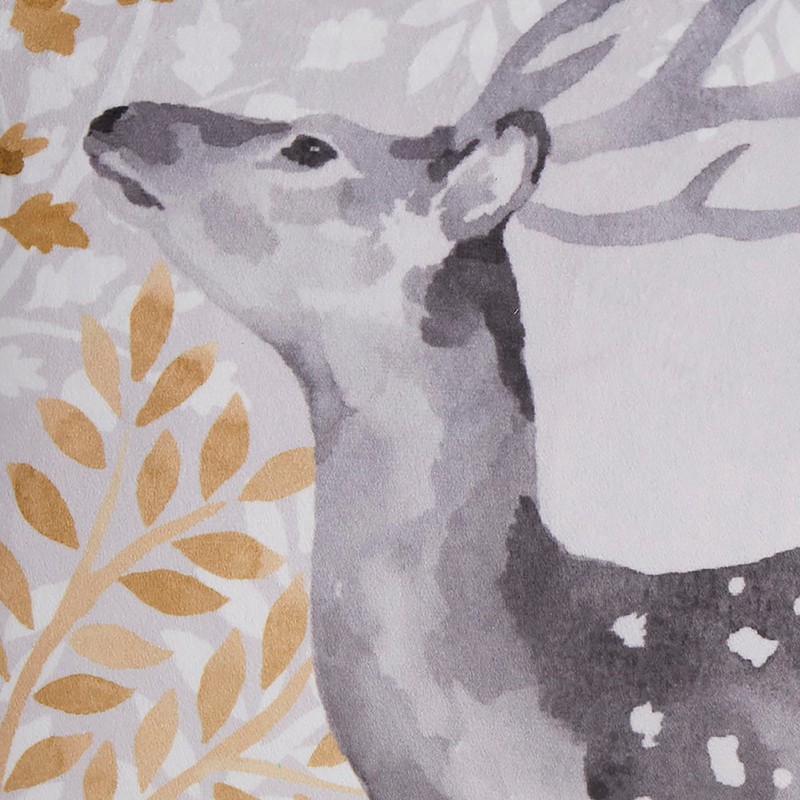 Dreams & Drapes - Grey Deer Velvet Cushion (43 x 43cm) - Filling Included - Piped Edge - Reversible Design - Grey Flannelette Cushion - Woodland Forest Deer Cushion with Cover Included/Cushion Insert
