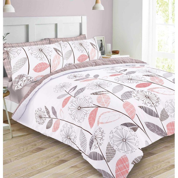 Dreamscene Bed Linen Set, Blush Pink Grey Floral Check, Single