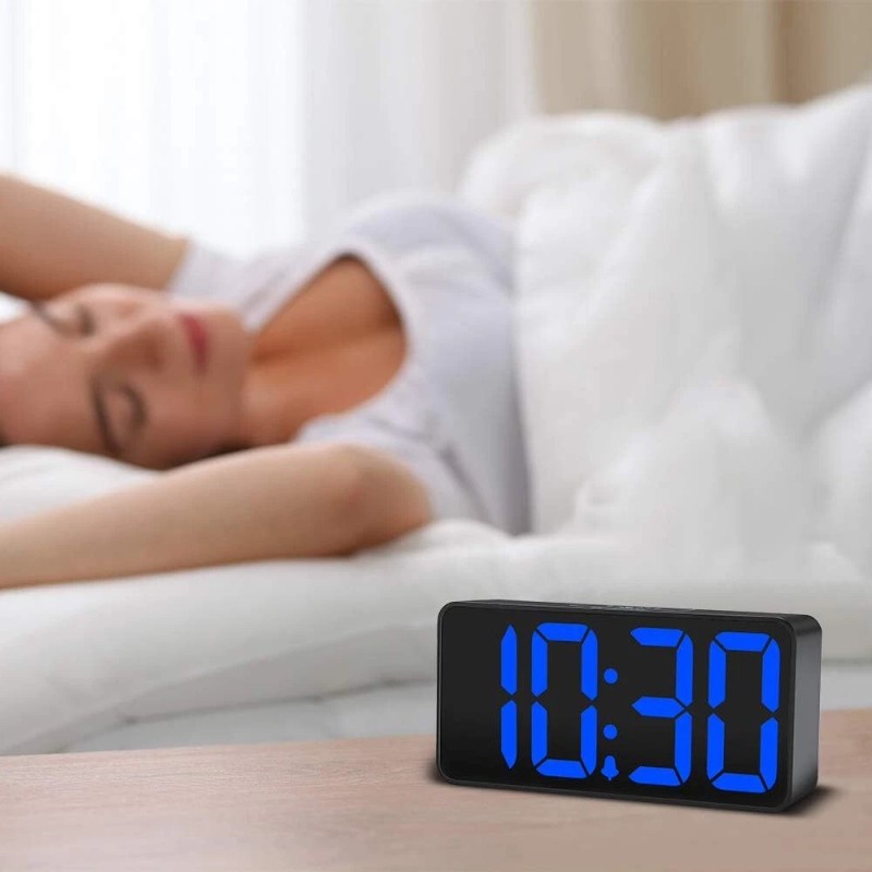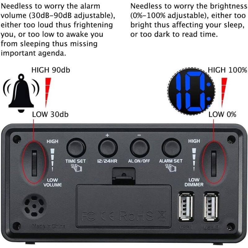 • Large Display Electric Alarm Clock with Brightness Dimmer: Corded plug in clock with compact streamline design yet large number display. 2 inches jumbo illuminated LED digits ensure the time is easy to see even for impaired vision people. The brightness dimmer allows you set the brightness of display, needless worry the brightness, either too bright thus affecting your sleep or too dark to read time.