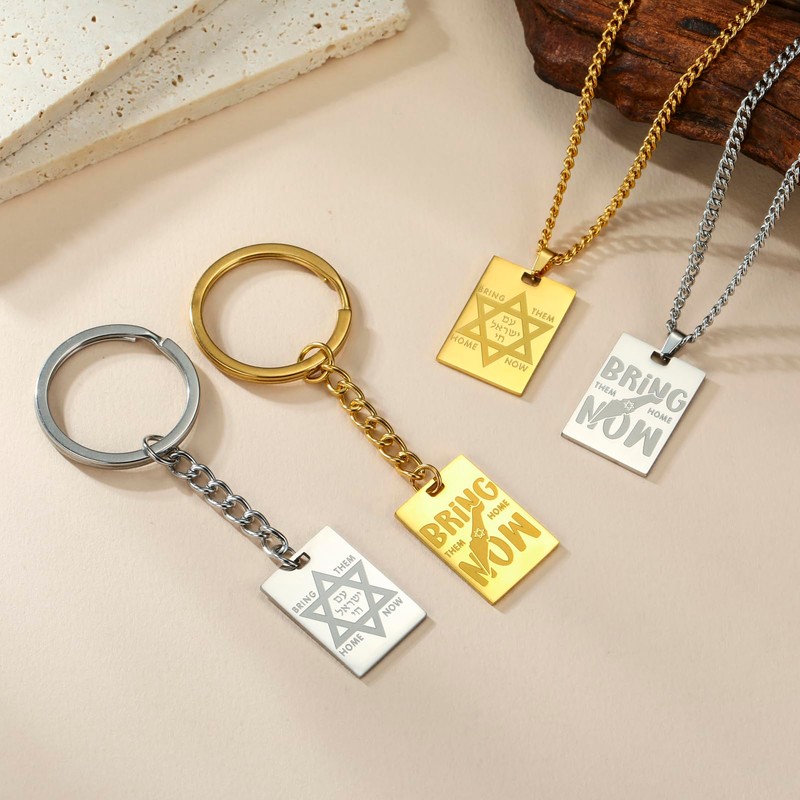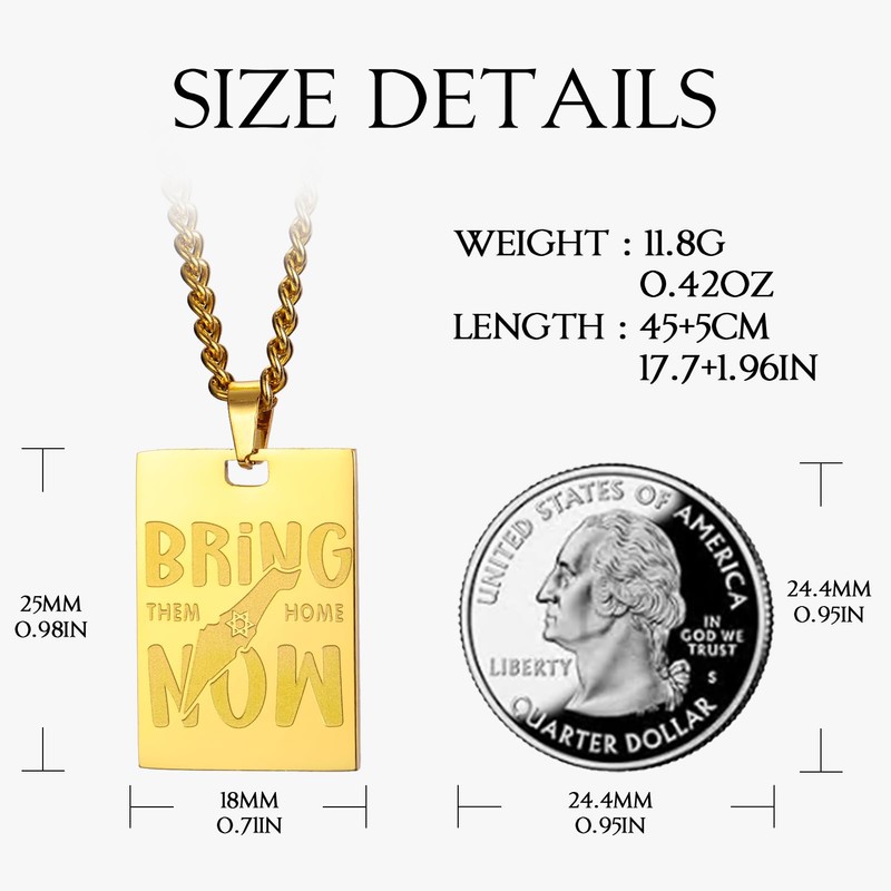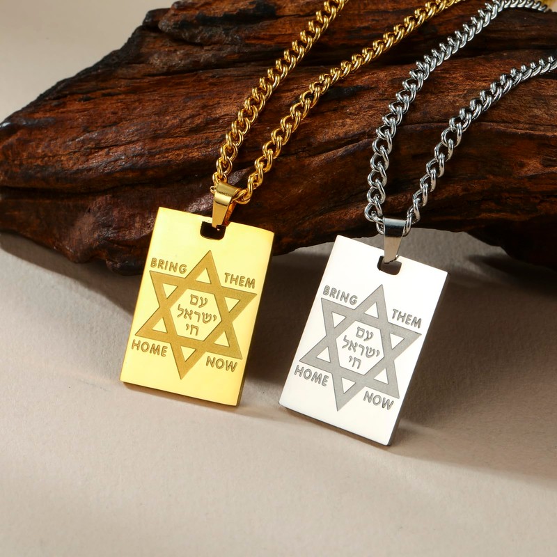 - Bring Them Home Now Necklace: This necklace has a double-sided design, with one side engraved with a map of Israel and Bring Them Home Now! represents support and encouragement during this difficult time, as we love peace and pray for God's blessing on Israel and the safety of its people. The other side is engraved with the Star of David in the hope that those who are suffering will be free from oppression and bondage and gain freedom and independence