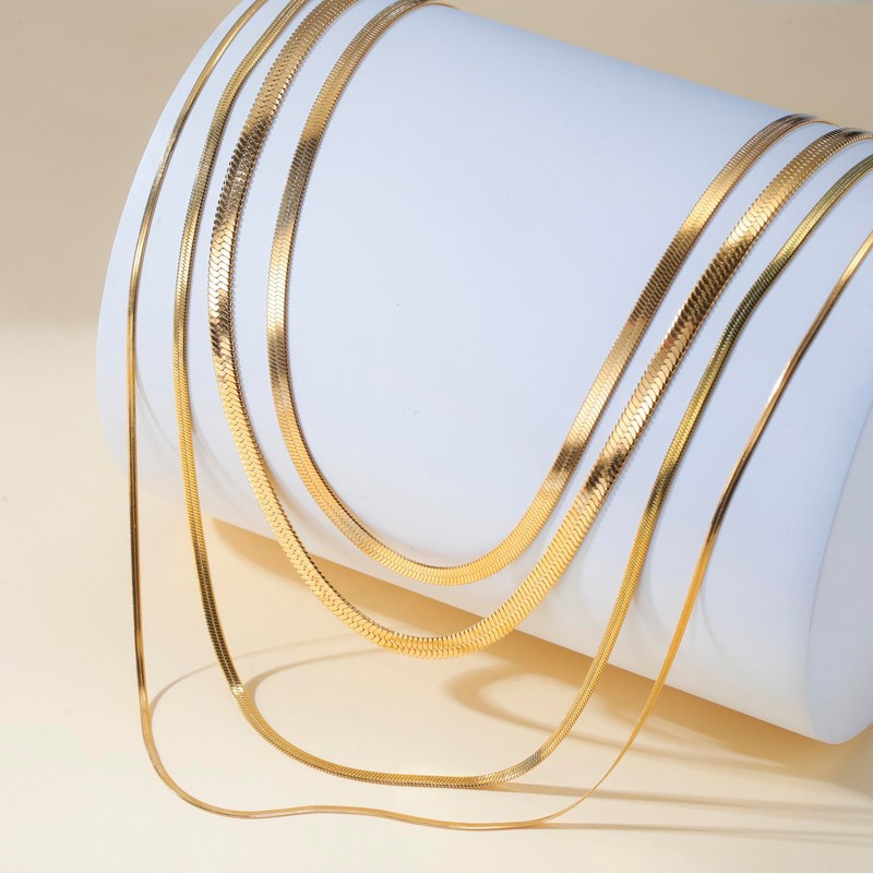 - Design concept: this herringbone necklace has a flat snake chain design that gives a simple style a stylish twist. Silky smooth, interwoven, polished links lie flat around the neck and shine in an elegant, rich sheen. It can be worn alone or paired with other favourite necklaces for a trendy look