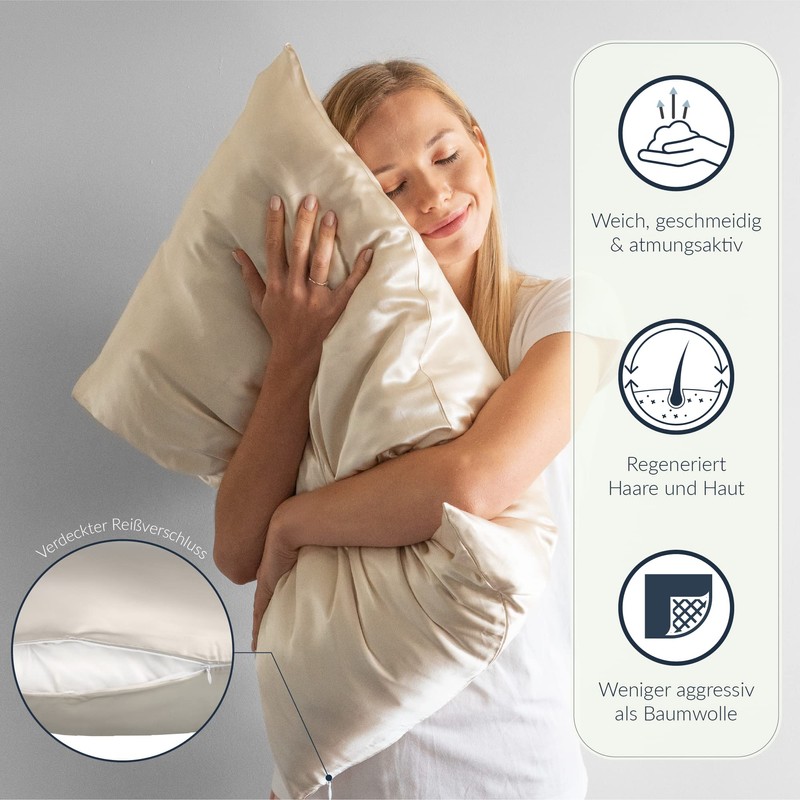 - Youthful skin – the natural proteins and amino acids of mulberry silk have an effect that prevents skin ageing. The 80 x 80 cm silk pillow for skin and hair reduces sleep wrinkles and wrinkles in general in a healthy way without drying out the upper layer of the skin