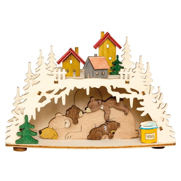Wooden craft sets from the Ore Mountains. The smoked house bear cave made of prefabricated and partially pre-stained wooden parts can be easily built and is a decorative eye-catcher in Advent and Christmas.
