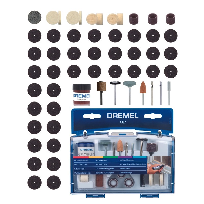 - Dremel multipurpose accessory set (687) contains an assortment of Dremel's best selling accessories in a convenient box