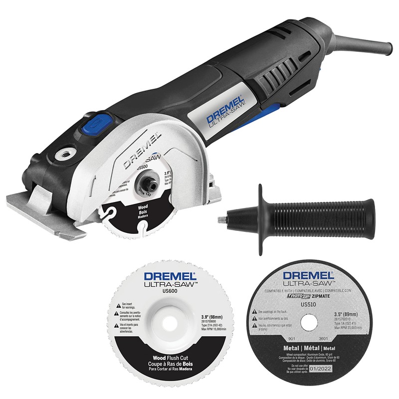 - KIT CONTENTS: Dremel Ultra-Saw US40 Tool, US500 4" Carbide Wood Cutting Wheel (x1), US600 4" Carbide Wood Flush Cutting Wheel (x1), US510 2.5" Metal Cutting Wheel (x1), and Auxiliary Handle (x1).