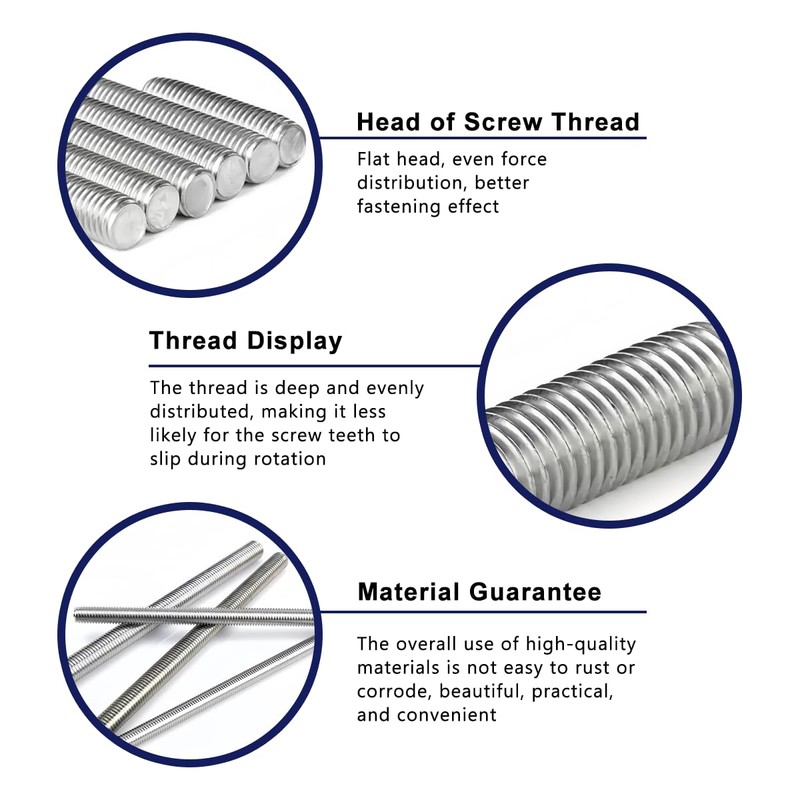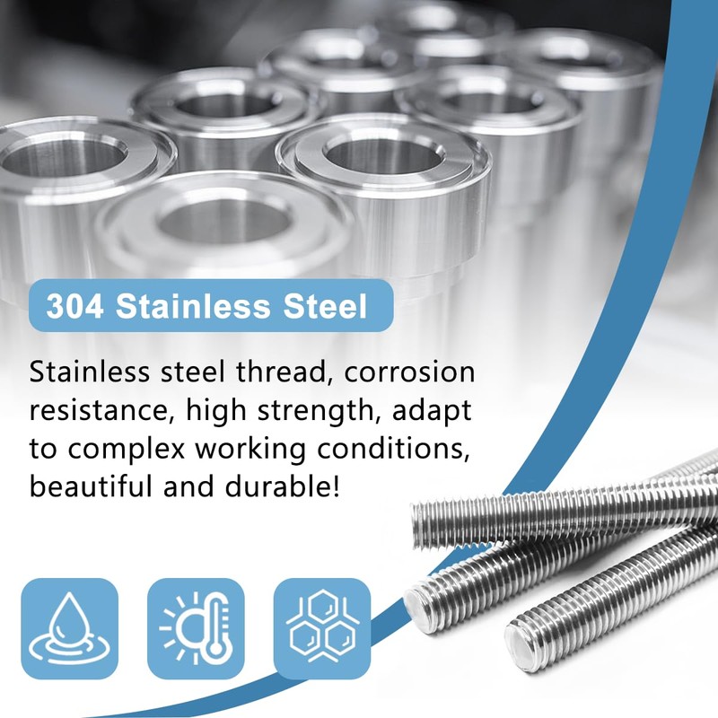 - Premium Material: Crafted from premium 304 stainless steel, our threaded rods are built to withstand corrosion and heavy loads. Ideal for humid environments or industrial applications, their durability and reliability ensure long-term performance.
