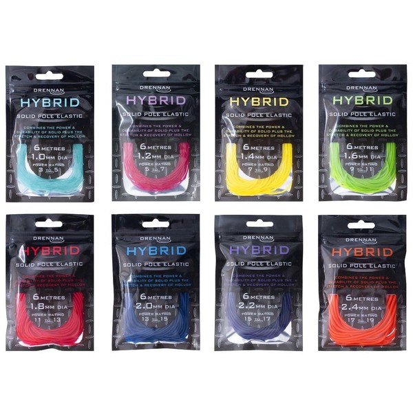 The new Drennan Hybrid Solid Elastic uses the latest polymer technology to produce a pole elastic that combines the stretch and forgiving nature of hollow elastic whilst retaining the power and strength associated with a solid. The super silk surface finish minimizes friction, increases durability and ensures the elastic recovers to its set position every time. With 8 sizes in the range covering diameters from 1.0mm up to 2.4mm every aspect of fishing is covered from silvers on river and canals right through to F1's and big carp on commercial fisheries. Each packet contains a generous 6.0m which is enough for two long top kits, or three shallow kits.