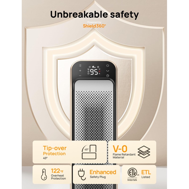 - Unbreakable Safety: This room heater for indoor is fully packed to safely warm up your winter. Built with V0 flame retardant material, reinforced plug, 45 tip-over and overheat protection certified by ETL. An additional child lock setting reduces the risk of accidents, making safer to heat and more secure to use.