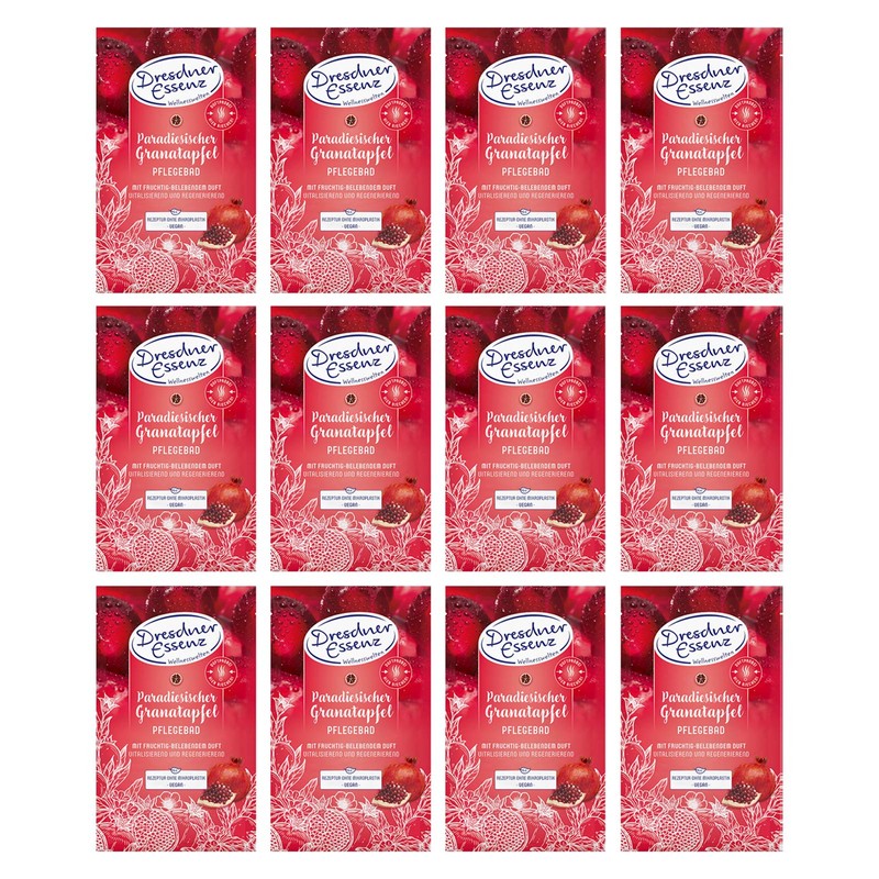 - The Dresdner Essenz paradise pomegranate bath for women contains 60 g. You will receive a pack of 12. One bag is enough for a full bath.