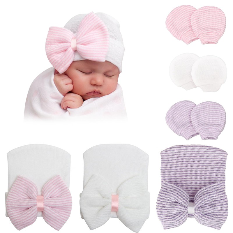 DRESHOW 3 Pcs Newborn Baby Hat and Mittens Infant Hospital Hat Beanie with Bow Soft Cute Knot Nursery Cap and Gloves for 0-3 Months Boys Girls