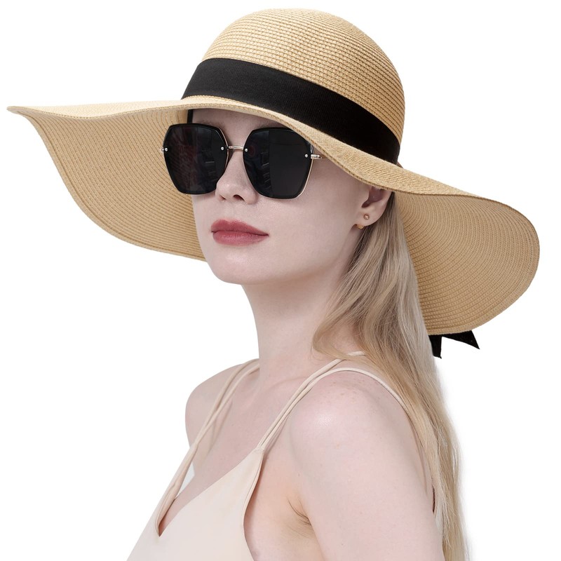 DRESHOW Women's Straw Hat with Wide Brim Floppy Foldable Cap Beach Sun Hat UPF 50+, Wide Brim Sun Hat: Beige