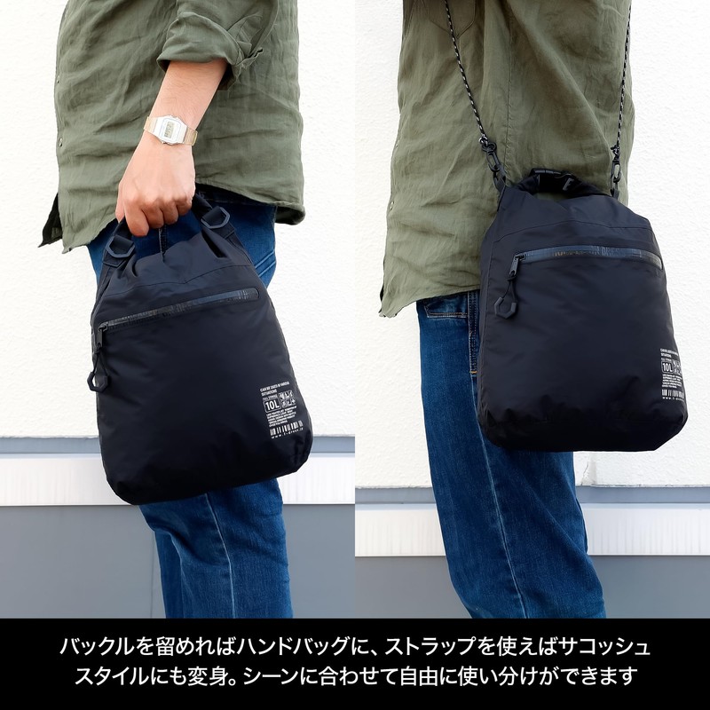 DRESS 2-way Dry Bag, 3.2 gal (10 L), Black, Waterproof, Compact, Lightweight, Portable, Fishing, Disaster Prevention, Camping, Sacoche, Tote Bag, Outdoors