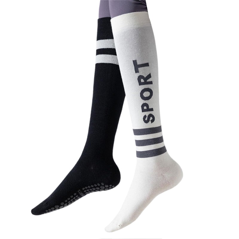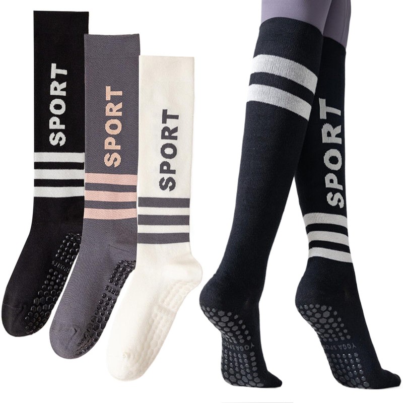 Knee High Non-Slip Socks with Grips and Sport Letter Print - Slipper Sock for Yoga and Pilates These knee high non-slip socks feature silicone grips on the bottom, making them suitable for yoga and Pilates. Made from 50% cotton or 90% nylon, they offer comfort and support. Stylish design includes two thick strips over the calf, three thick stripes above the ankles, and a "SPORT" letter print on the side calf. Great for everyday wear, gym, tennis, and other sports activities.