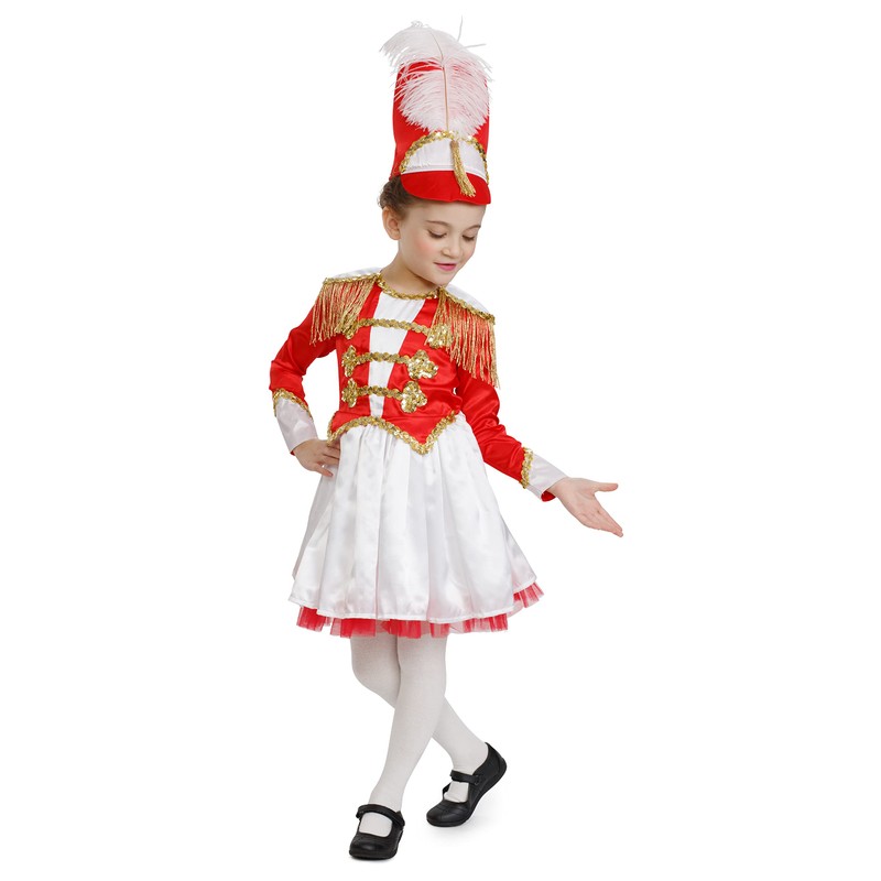- Marching Band - The costume comes complete with a dress and hat. The cylinder shaped hat as a white plume feather and gold tassel.