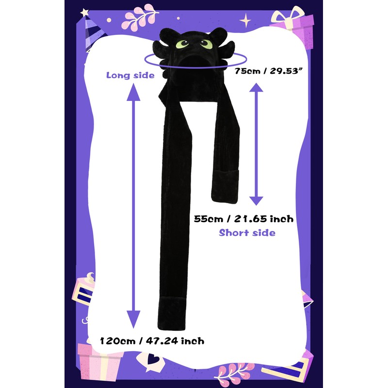 - MULTIPURPOSE This dragon hat is not only a warm 3 in 1 plush hat scarf glove set, but also can be used for dragon hat costumes, Halloween costumes, carnival, crazy hutdays, etc. It is also a great birthday and Christmas gift, come and prepare a surprise for your friends and family members who love this movie character!
