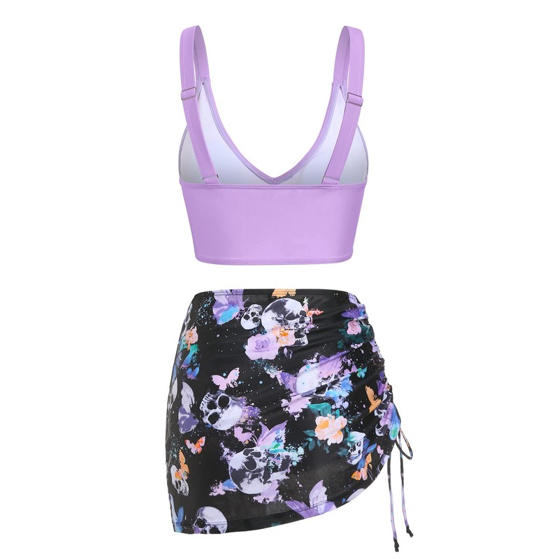 【Bathing Suit with Skirt】 This Gothic swimsuit will be a must-have on your vacay wardrobe. The set is made of a twisted pad top, high waist bottoms and skirt printed with skull butterfly print for a chic look.