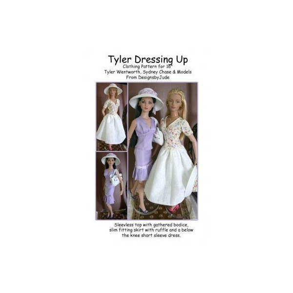 Clothing pattern to fit 16" Tyler Wentworth and similar size dolls. The pattern includes a below the knee sleeveless dress with a gathered bodice, a short sleeve top with a gathered bodice and a slim fitting skirt with pleated edge. Designs by Jude offers patterns for 7-22" fashion dolls and some BJD dolls. Just search by Designs by Jude or the particular doll you are sewing for.
