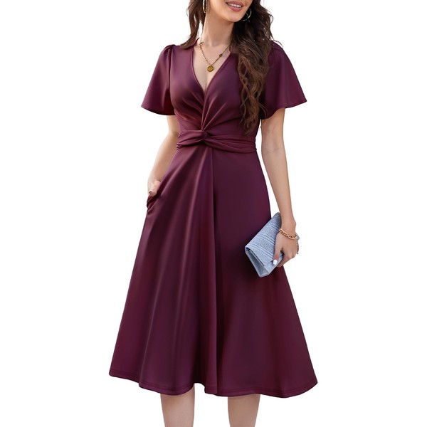 DRESSTELLS Women's Cocktail Pockets Dress 2025, Formal Wedding Guest Aline Bridesmaid Prom Spring Church Casual Valentines Twist Knot Dresses Burgundy L