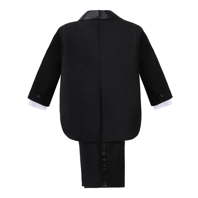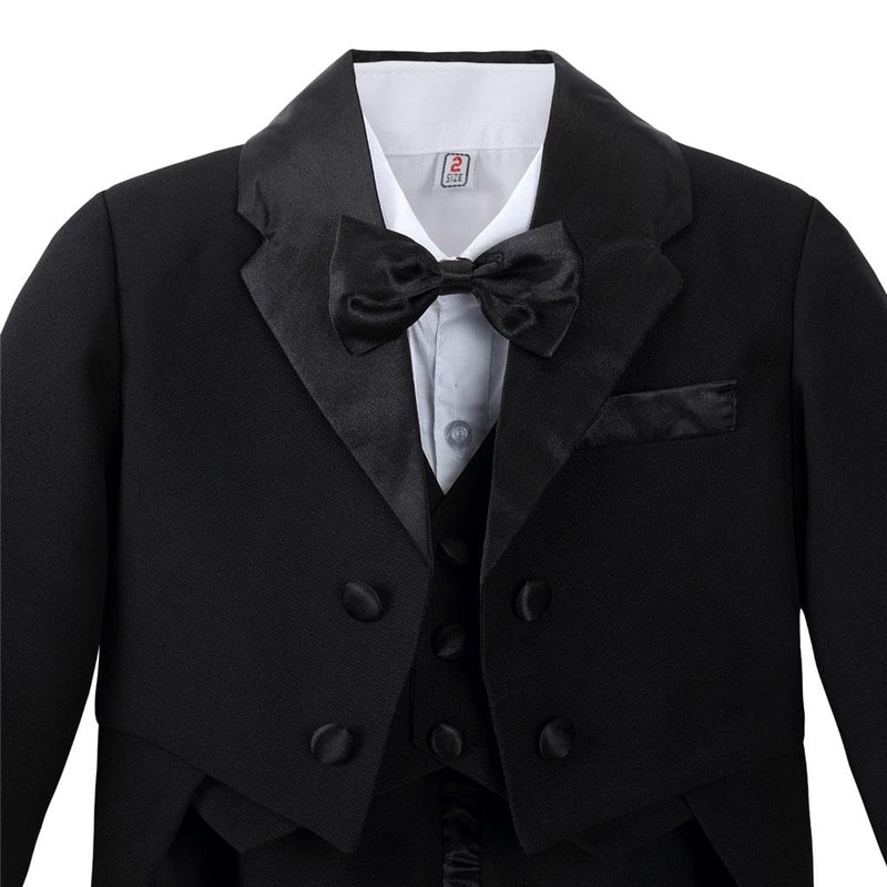 - 【Conjunto de 5 piezas de traje de esmoquin para bebé】Incluye blazer de esmoquin con cola, camisa de vestir blanca, pajarita ajustable, chaleco y pantalones. Fabricado en lujoso poliéster (65 %) y algodón (35 %). Color: negro, blanco y marfil