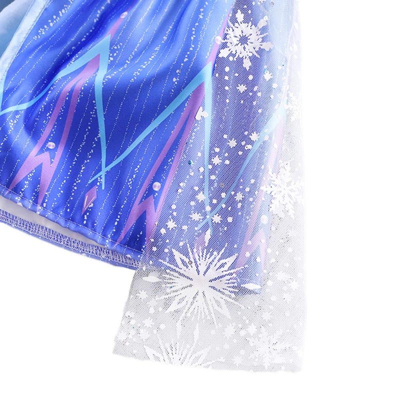 • Pale blue sleeveless cotton bodice with round neckline. Features a shiny V sequin panel with lace trim and frosty prints. Faux satin belt with ice crystal pattern. The flapping petal on shoulder add a gorgeous touch to the dress!