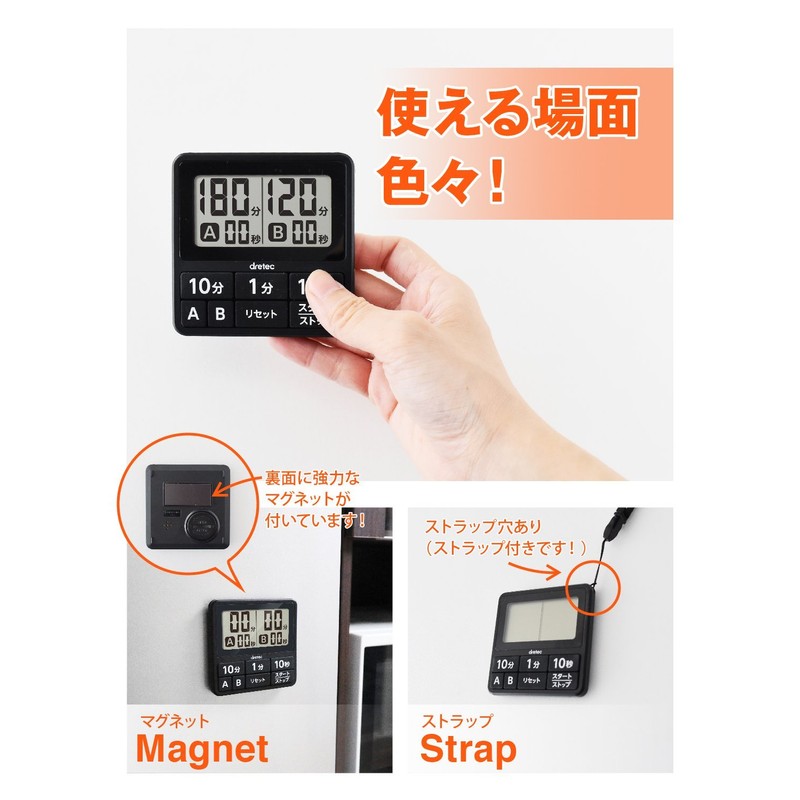 - Manage 2 Times in 1: This is a 2-time timer that can be used to control two times with a single timer. You can use it in a variety of ways, such as setting the time of cooking and setting the time for instant ramen. Useful when you want to do multiple tasks at once, such as studying, cooking, stretching, or working