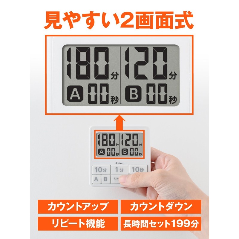 - Splash-proof: Splashproof specification that can be used even with wet hands (IPX2 equivalent, not waterproof). You can also use the timer set while cooking. You can set the timer up to 199 minutes and 50 seconds. The "10 minutes", "1 minute" and "10 seconds" buttons are easy to operate and set the time
