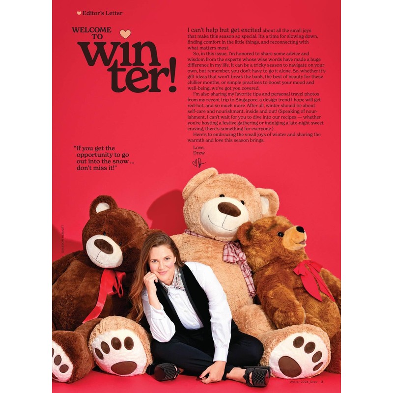 In the Winter 2024 issue, Drew shares heartfelt reflections on the joys of the season, emphasizing the importance of slowing down and cherishing small moments. The edition includes expert advice on budget-friendly gift ideas, beauty tips for colder months, and uplifting practices for well-being. Additionally, readers can enjoy delightful recipes and tips from Drew's travels to Singapore, all aimed at fostering warmth and nourishment during winter.