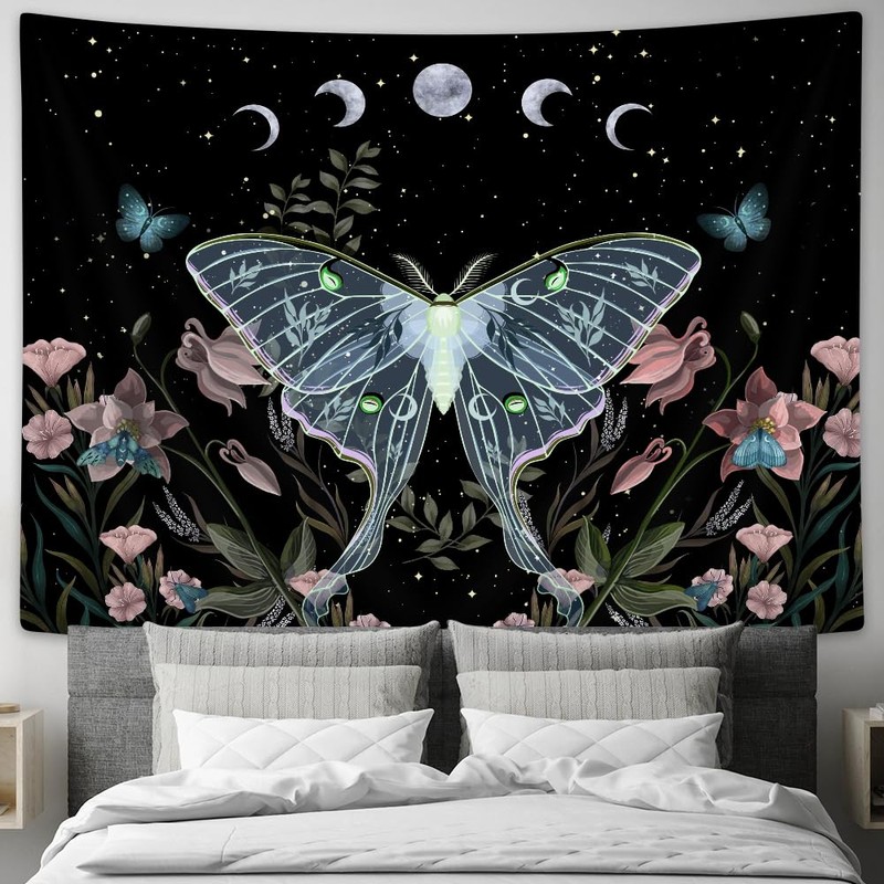 Drgilau Blue Moth Tapestry Wall Hanging, Moon Phase Stars Cute Plants Butterfly Floral Botanical Nature Aesthetic Celestial Wall Tapestries for Bedroom Home Living Room Dorm 80X60 Inch