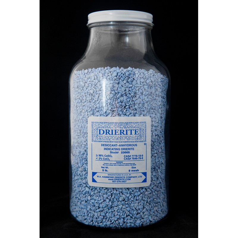 DRIERITE, 8 Mesh, Indicating Desiccant (Sold by Each - 5lb Bottle). This product is anhydrous calcium sulfate impregnated with cobalt chloride for a clearly visible color change when the desiccant needs to be changed or regenerated.