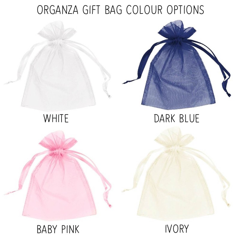 To make this extra special we include its very own gift box and organza gift bag. Choose from the drop-down menu to advise us which colour gift bag you would like.