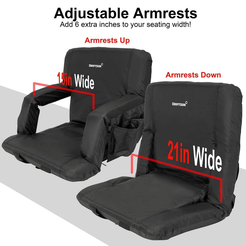- VERSATILE: Stadium seat features six adjustable positions. Integrated armrests for maximum comfort. Armrests can also be inverted to increase the width of the seat to 20 inches.