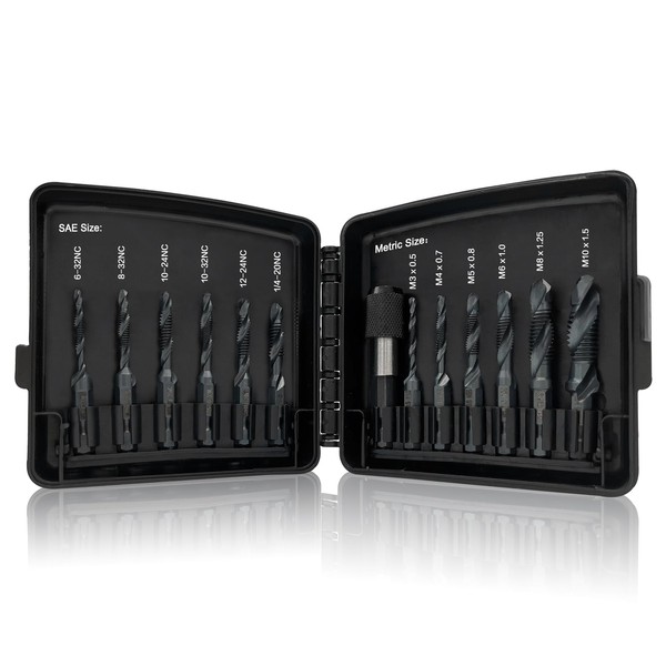 Drill & Tap Bits Set of 13 pcs - 6 SAE Sizes: 6-32NC to 1/4-20NC, 6 Metric Sizes: M3 to M10 and a Quick-Change Adapter – Combine Drilling Tapping Threading Countersinking Functions in One Bit, Black