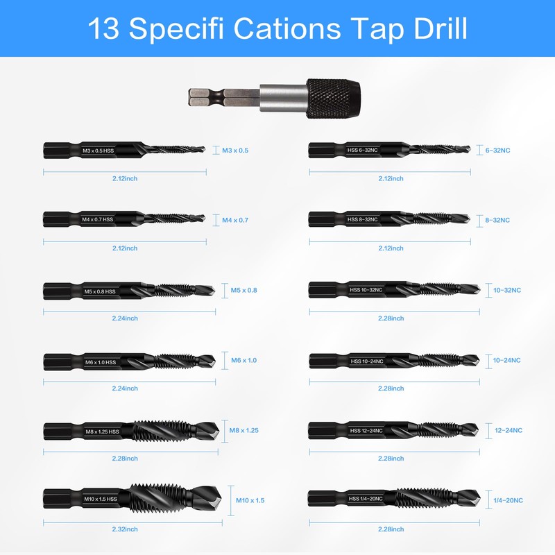 - Versatile Range of Sizes: Be prepared for various projects with our tap bit set that includes 6 SAE sizes: 6-32NC, 8-32NC, 10-24NC, 10-32NC, 12-24NC,1/4"-20NC, and 6 Metric sizes: M3 x 0.5, M4 x 0.7, M5 x 0.8, M6 x 1.0, M8 x 1.25, M10 x 1.5.