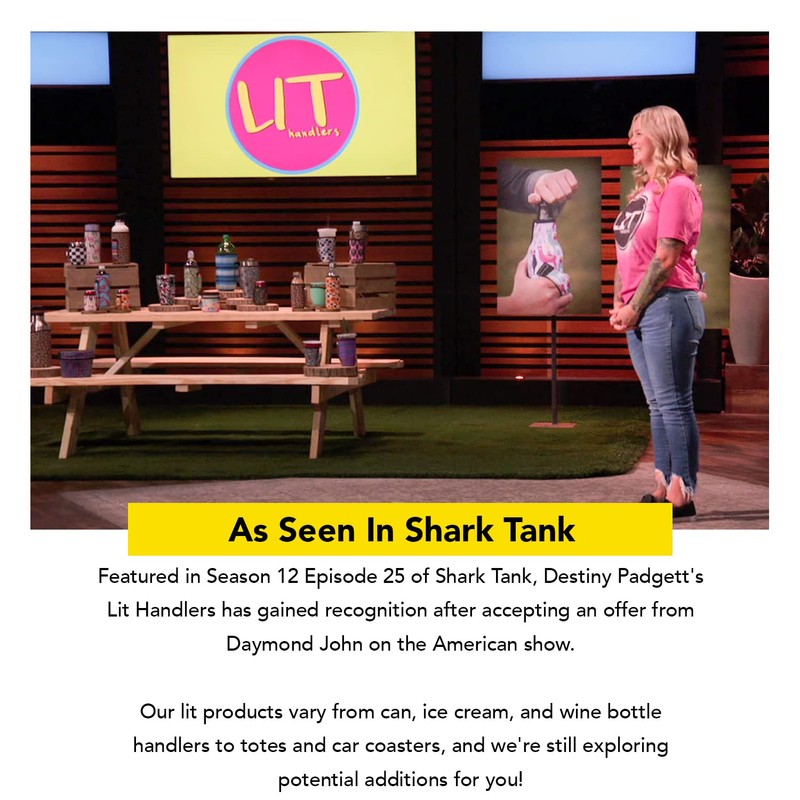- As Seen in Shark Tank: Featured in Season 12 of Shark Tank, Destiny Padgett’s Lit Handlers has gained recognition after accepting Daymond John’s offer. Our lit products vary from can, ice cream, and wine bottle holders to totes and car coasters.