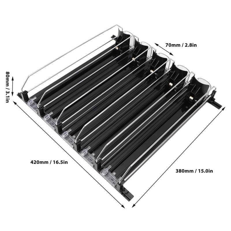 - 【Adjustable Design】This refrigerator beverage holder measures 480x380x80mm / 18.9x15.0x3.1in to fit most standard can and bottle sizes, the refrigerator's can dispenser is adjustable, it can accommodate narrow to wide drinks with a simple slide back and forth, making it versatile and convenient.