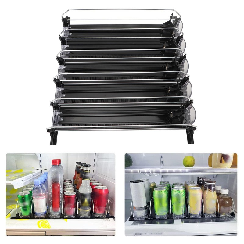 - 【Reliable Material】This refrigerator drink organizer is made of food grade ABS, sturdy structure, wear-resistant, not easy to damage, can be used for a long time. This fridge can be organized to push no tools needed to assemble, with tape on the bottom, you can choose to attach the fridge drink organizer to the fridge shelf to prevent sliding.