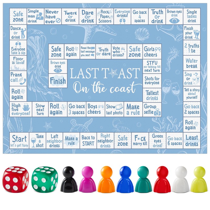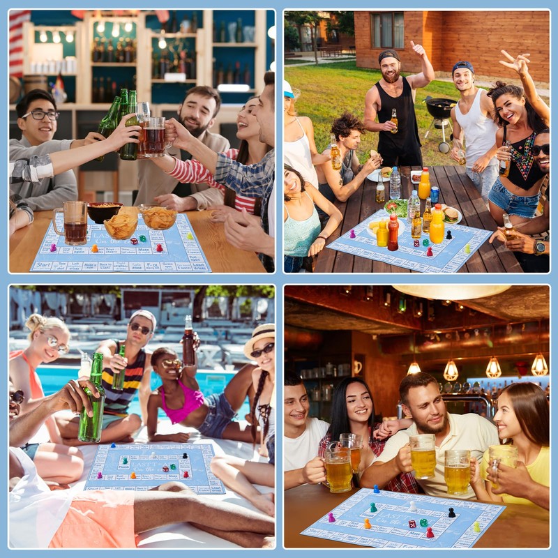- Complete Party Game Set: This all-in-one drinking board game includes a blue 15.0 x 11.0 inch rubber mat drinking board game, 8 multicolored game pieces, and 2 red and green dice - everything needed to bring instant fun to any gathering. Designed for 2–8 players, this interactive drinking game is suitable for ages 21+, making it the ideal addition to adult games for game night, house parties, and celebrations with friends.