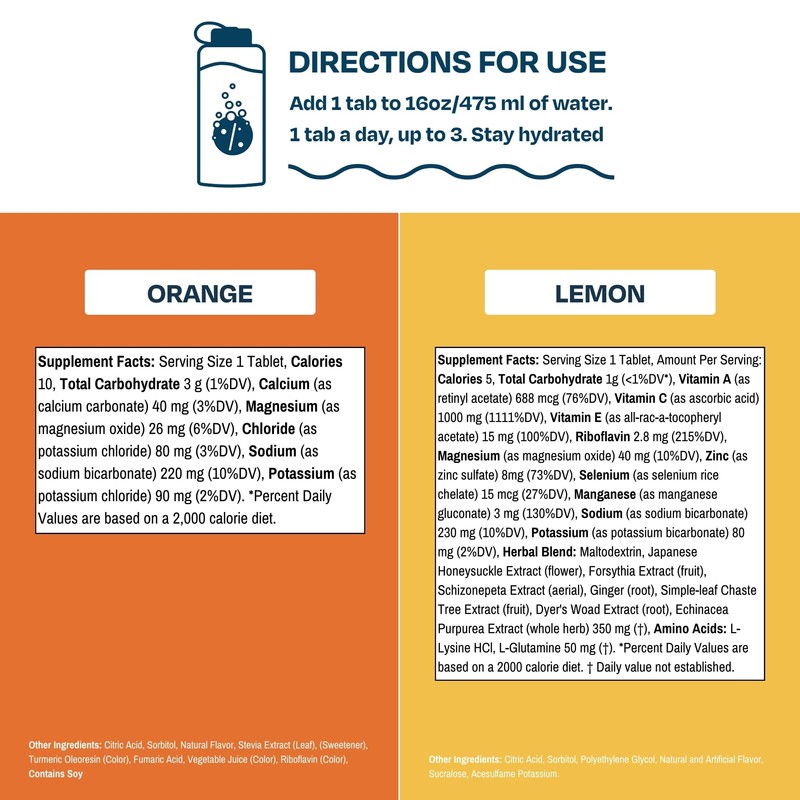 - Includes (1) 10-tablet Orange Daily Hydration and (1) 10-tablet tube of Lemon Daily Immune Support. Sugar-Free, Gluten-Free, Vegan, Dairy-Free.