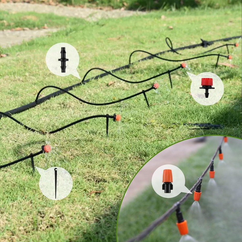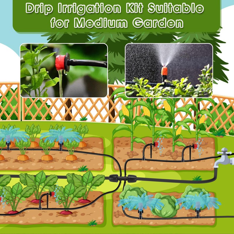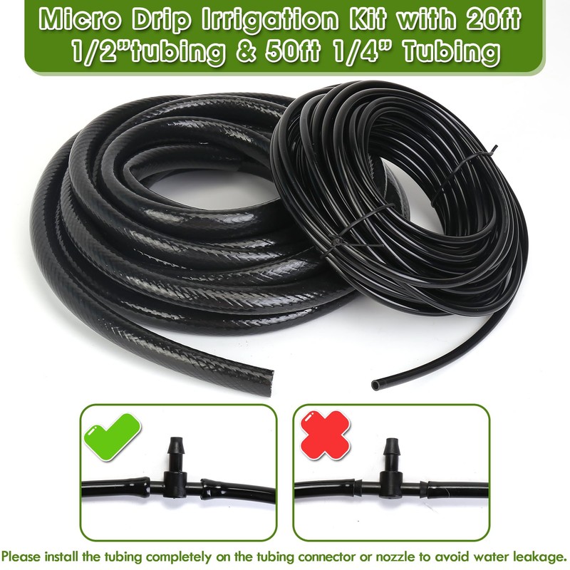 - Large Drip Irrigation System - Use our irrigation set to take care of your plants: 20FT 1/2" + 50FT 1/4" irrigation tubing can water all plants at once. After simple installation, the large irrigation kit can irrigate an area of 110 square feet.