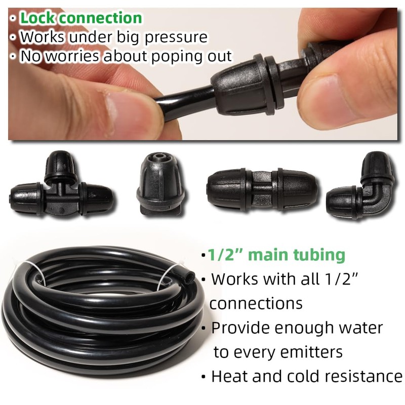 - Lock connection design making the system be able to endure bigger water pressure. No need to worry about dripper or connections popping out. Works fine in long period of time.